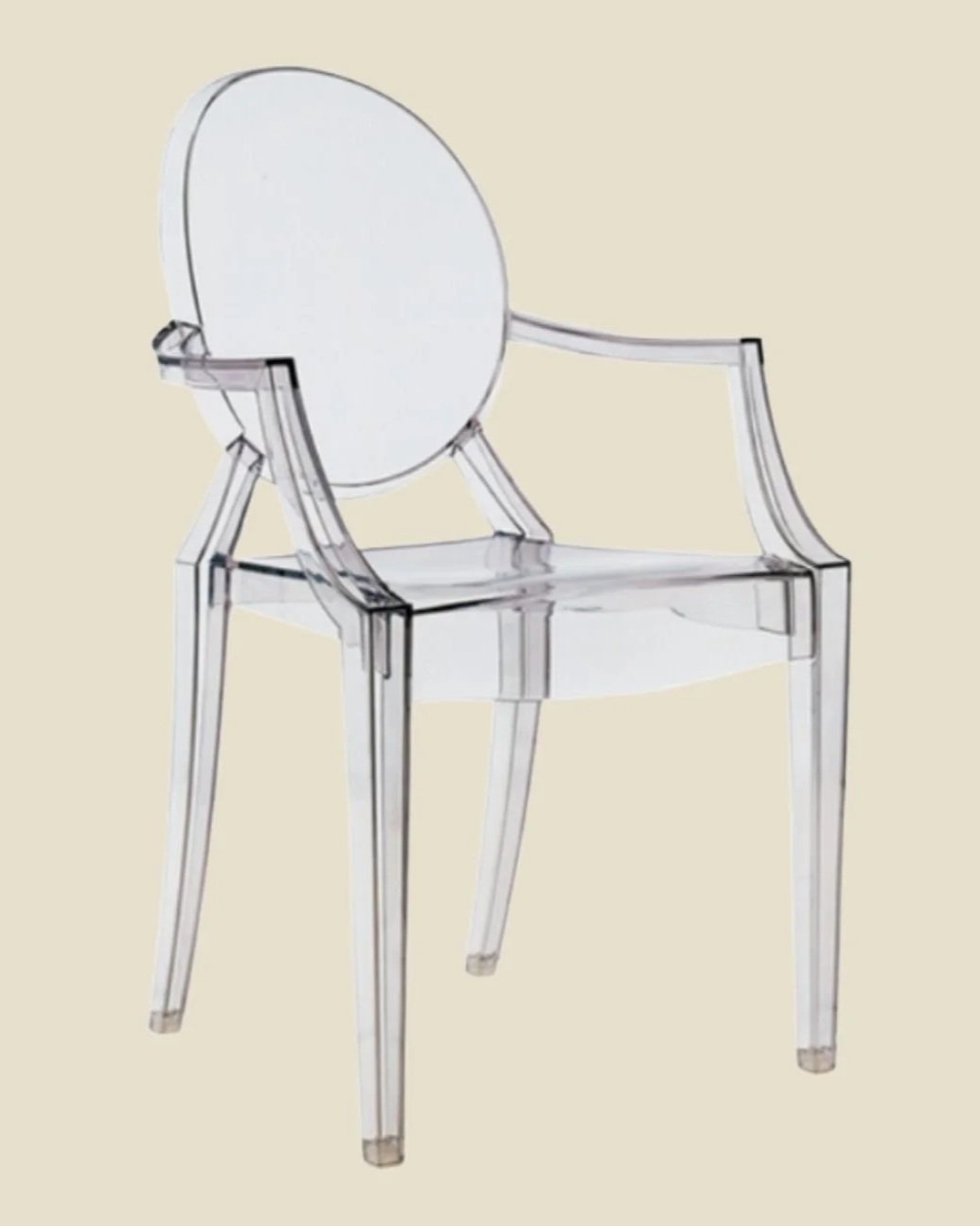 Arguably the first truly iconic chair of the 21st Century, the Louis Ghost is made entirely out of transparent polycarbonate material and has a unique form inspired by 18th-century French furniture (the Louis XVI style specifically). Louis Ghost Chair adds a touch of timeless charm while creating the illusion of space and lightness. It's quite versatile and suitable for both indoor and outdoor use.